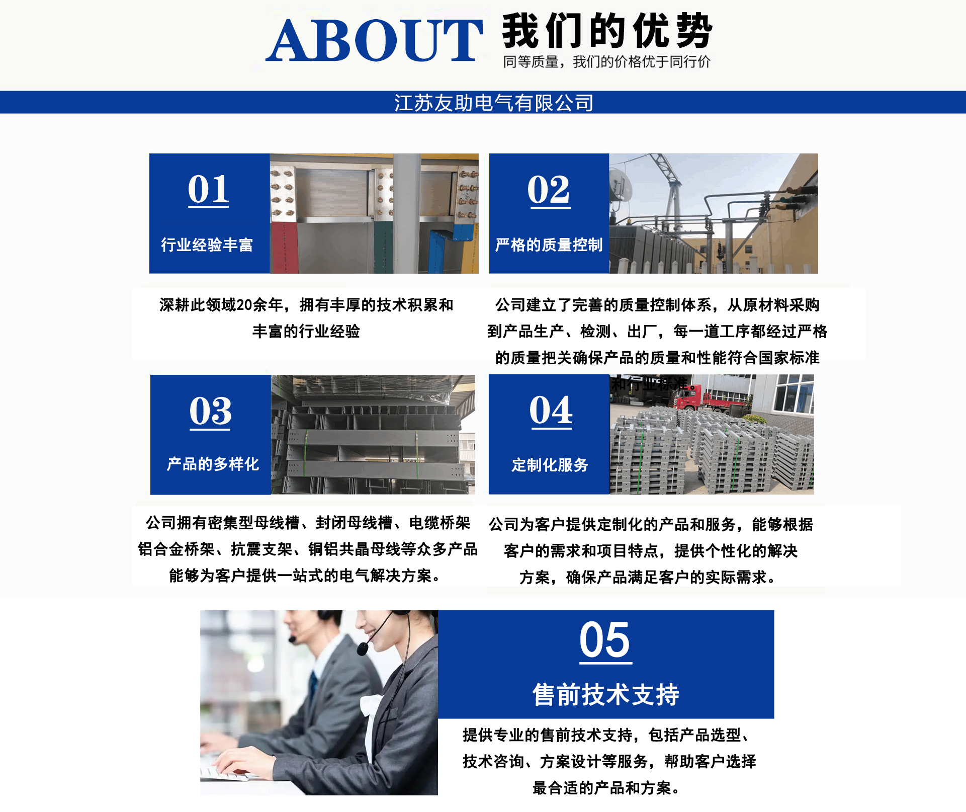 江蘇友助電氣有限公司地處中國工程電氣生產(chǎn)基地-一江蘇省揚中市。經(jīng)營范圍:電纜橋架,母線槽(橋),管型母線,銅軟連接(伸縮節(jié)),高低壓開關(guān)柜,配電箱,抗震支架產(chǎn)品系列?!」咀谥迹嚎蛻糁辽?。已成功為江蘇二十屆省運會會場-泰州體育館,南京寶龍商業(yè)綜合體,張家口百兆瓦風(fēng)電場,濟源市婦幼醫(yī)院,威海市未來科技園,湖北皇恩燁新材料科技有限公司,南京中央路小學(xué),南通中天大酒店,新疆新安特鋼有限公司,河北省送變電有限公司,南京南微醫(yī)學(xué)研發(fā)基地等多項工程配套服務(wù),我們愿與您精誠合作,互利共贏!公司技術(shù)人員深耕橋架,母線領(lǐng)域30年,為您提供橋架,母線槽疑難問題解決方案。母線槽不論每相是單排,雙排,三根排重疊,不管有多少個水平彎、垂直彎,轉(zhuǎn)接排在發(fā)貨前預(yù)裝一遍,確保尺寸無誤。到現(xiàn)場直接擰螺絲,效率高,橫平豎直,規(guī)規(guī)矩矩,符合標準,供電局,業(yè)主,監(jiān)理,驗收易通過。供貨周期3-7天。為了讓尊貴客戶您,設(shè)備安全通電,高枕無憂。我們提供如下售前售中售后服務(wù): 售前:免費技術(shù)支持,咨詢?!∈壑?免費現(xiàn)場精確測繪、設(shè)計?!∈酆?安裝服務(wù),免費指導(dǎo)?!≠|(zhì)量是生命,客戶是源泉。承諾客戶的,一定全力做到。讓我們一起進步!...